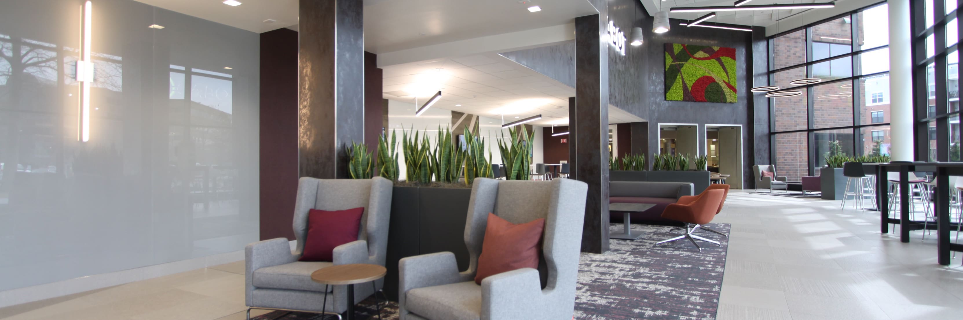 ahp Architects worked with the team at National Development to reinvent the common areas at their newly acquired multi-tenant 4-story building in Medford, MA. The scope included extensive changes to the main lobby and café gathering space, introduction of a new fitness facility, elevator modernization and full restroom refurbishment. Unique materials such as largescale porcelain sheet, moss and back painted glass were introduced to create dramatic reflection and texture. A spec suite with exposed deck, pendant lighting and new furniture was created on the 4th floor to draw the attention of prospective new tenants. The project was completed in Spring 2020.